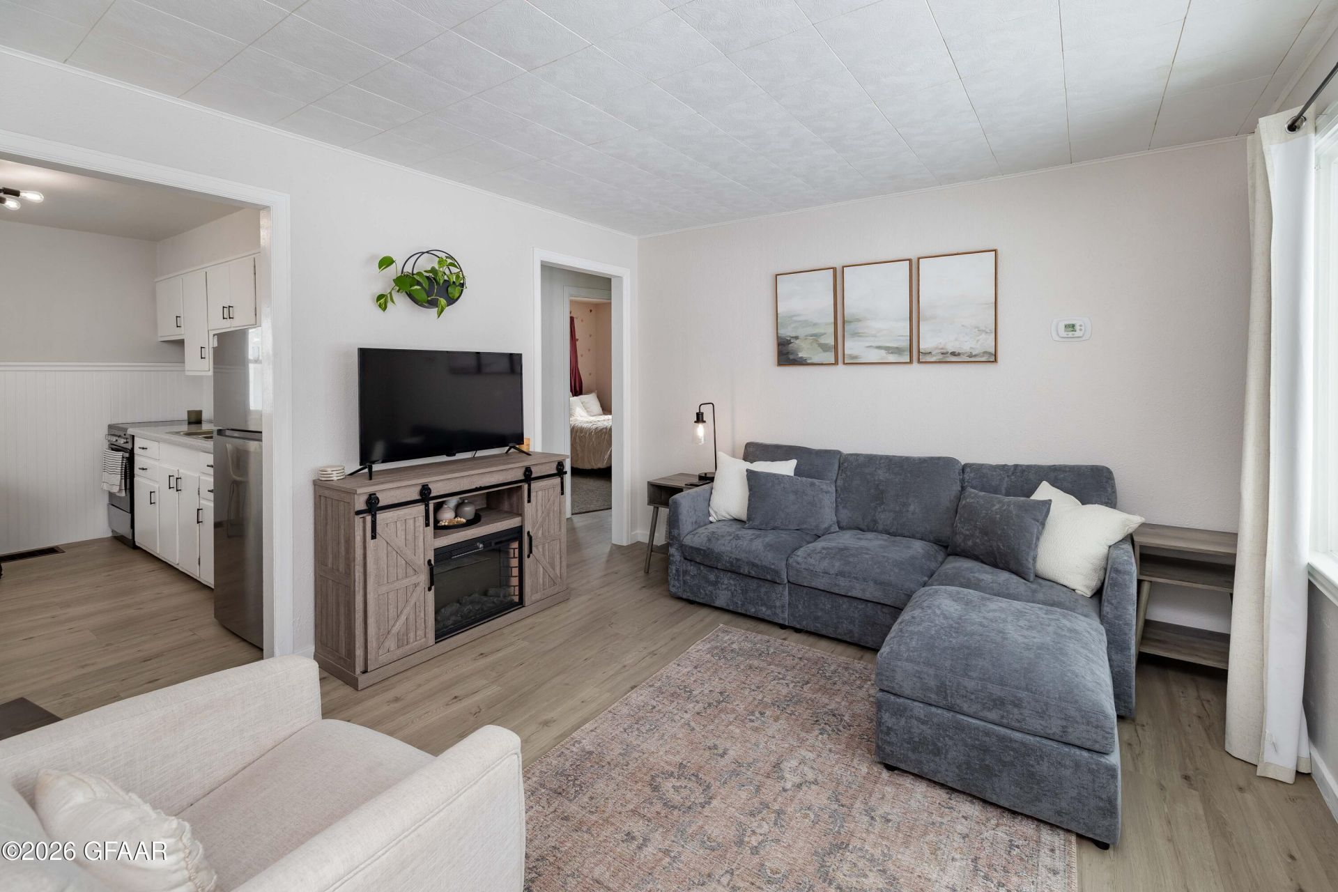 Move-in ready and full of charm! This 2-bedroom home features updated flooring, fresh paint, and a cozy kitchen and living room. The full unfinished basement provides laundry and room to grow. Outside you'll find a detached garage and a fully fenced, generously sized backyard in a charming south Grand Forks neighborhood.